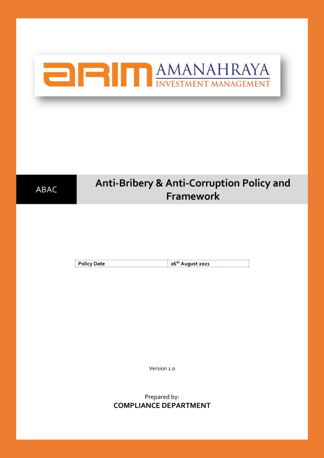 This anti-bribery policy exists in line with the Malaysian Anti-Corruption Commission Act 2009 ("MACC Act" or the “Act”) to set out the responsibilities of AmanahRaya Investment Management Sdn. Bhd. (“ARIM” or the “Company”) and those who work for us in regards to observing and upholding our zero-tolerance position on bribery and corruption.