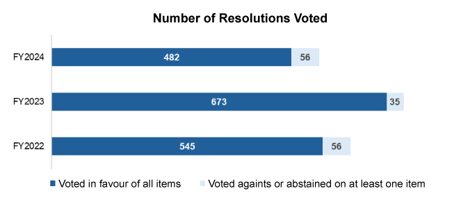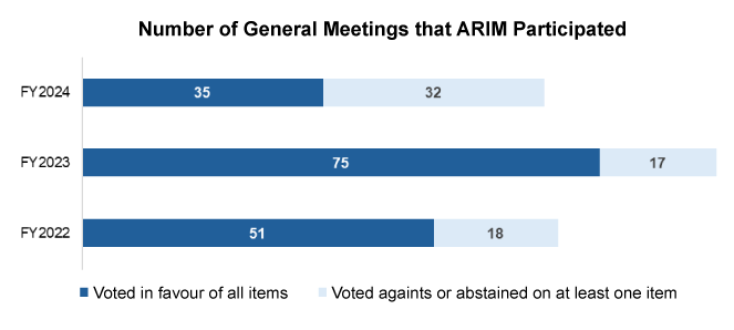 In 2024, we actively participated in 67 shareholders meetings, casting votes on a total of 538. Of 67 meetings, 35 (52%) voted in favour of all resolutions while 32 (48%) voted against or abstained on at least one item. In total, ARIM voted "with" management on 482 (90%) resolutions and "Against" or "Abstain" on 56 (10%) resolutions.